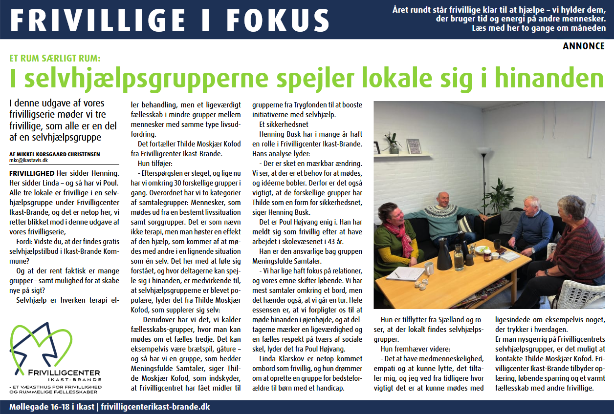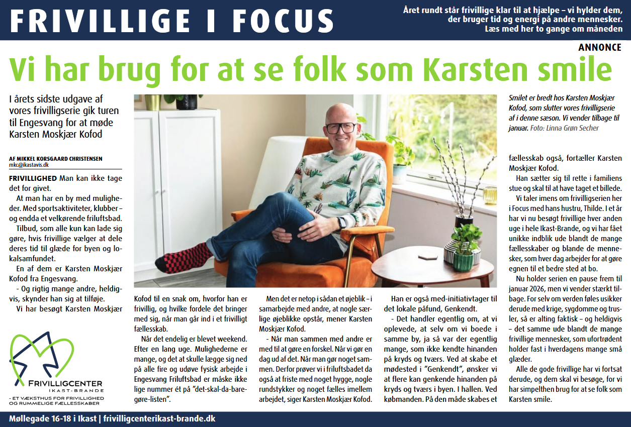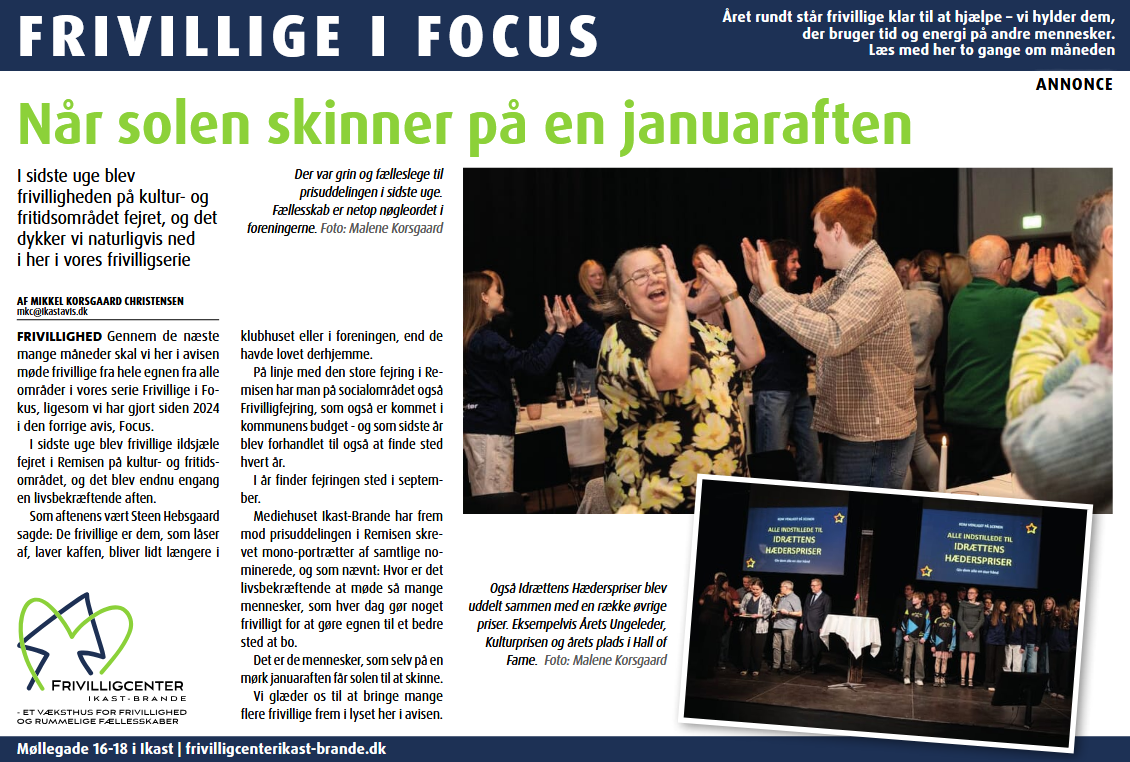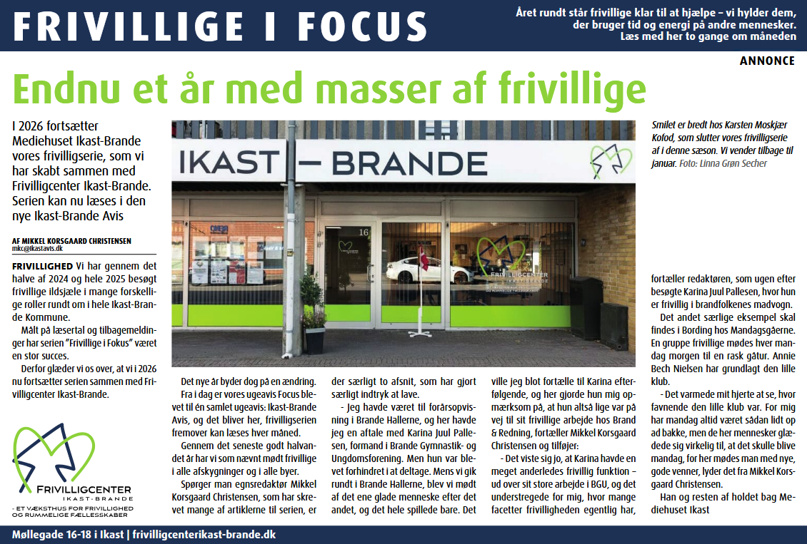 Frivillige i Focus er et samarbejde med Mediehuset Ikast-Brande om at sætte lys på frivilligheden i Ikast-Brande.